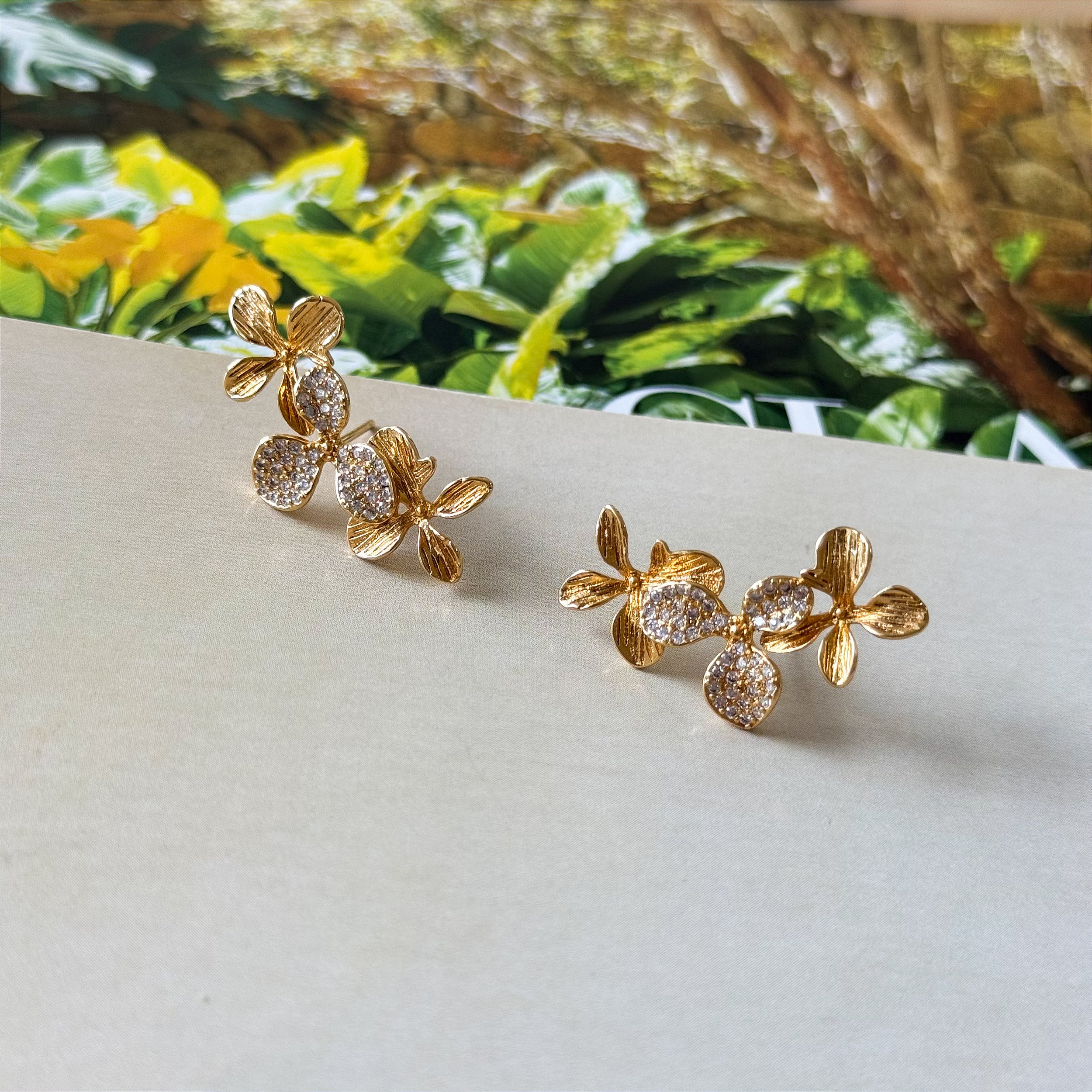O brinco é feito em metal dourado com acabamento que destaca as flores e o brilho das zircônias. O formato acompanha o contorno da orelha, oferecendo conforto e segurança na fixação. O produto não possui informações detalhadas sobre material ou quantidade, focado no estilo e no acabamento.