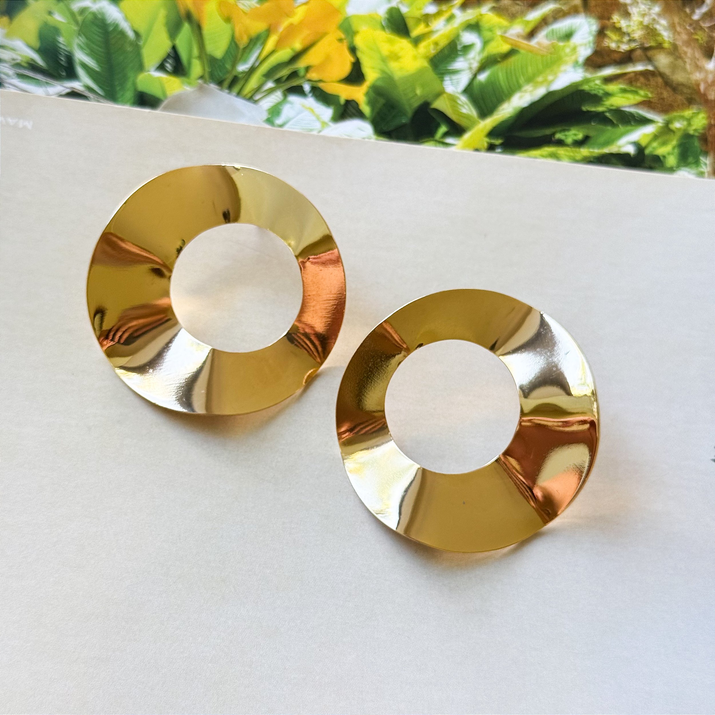 O brinco possui acabamento liso com superfície reflexiva e espelhada, proporcionando um visual clean e sofisticado. Seu formato orgânico traz leve ondulação que confere movimento e elegância. O banho de ouro é aplicado uniformemente, garantindo proteção contra oxidação. A peça acompanha tarrachas para melhor fixação e ajuste seguro.
