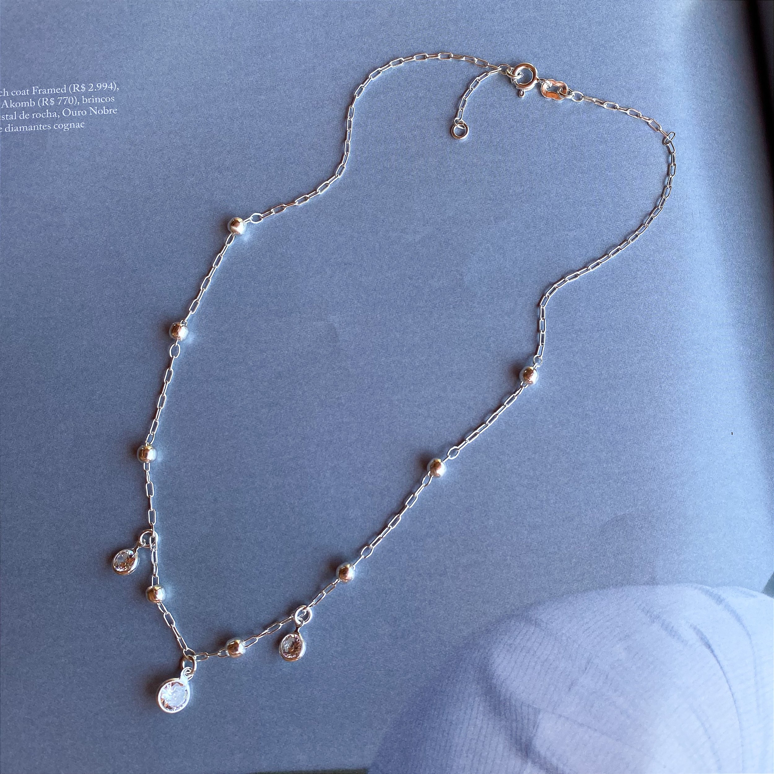 Colar prata 925, bolinhas lisas e 3 pontos de luz em zircônia cristal.
