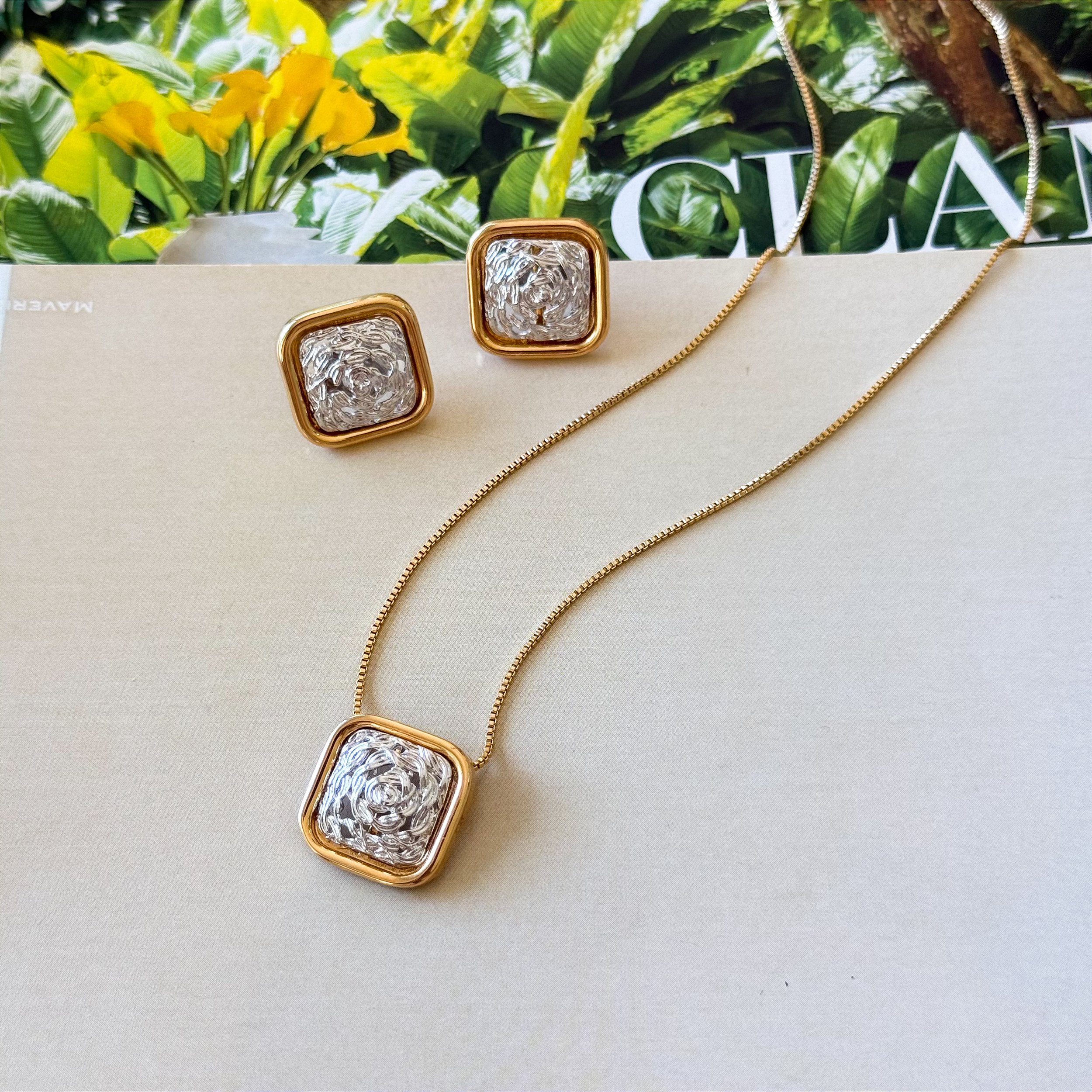 Conjunto de colar e brincos com design orgânico em formato redondo ou quadrado, ideal para quem busca estilo e versatilidade. O mix de banhos torna cada peça única e moderna.